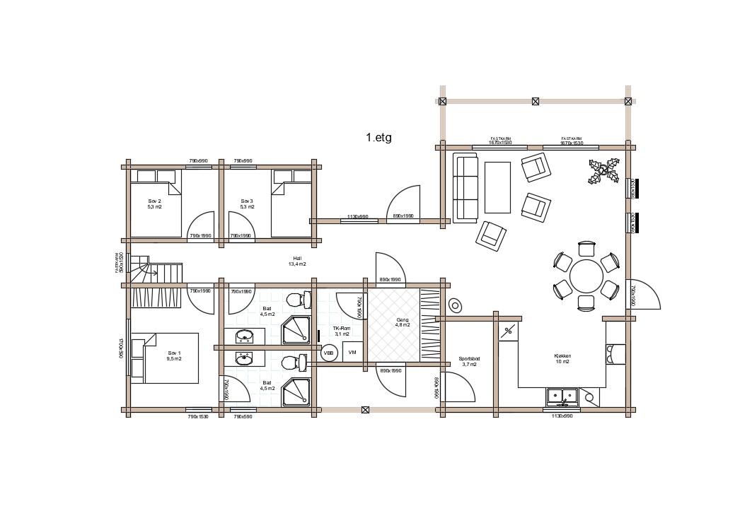 Løsningen inkluderer to bad, i tillegg til et praktisk teknisk rom med kombinert vaskerom og WC. Dette gir høy brukskomfort og gjør hytta godt egnet både for helger og lengre opphold. De åpne flatene bidrar til en luftig og romslig atmosfære.