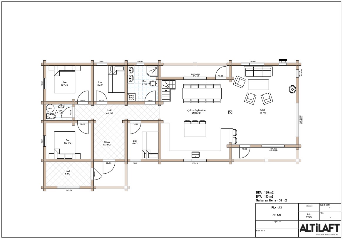 Med et bruksareal på 120 m² får du en romslig og praktisk hytte som kombinerer norske kvalitetsmaterialer, solid tømmer og lang levetid.